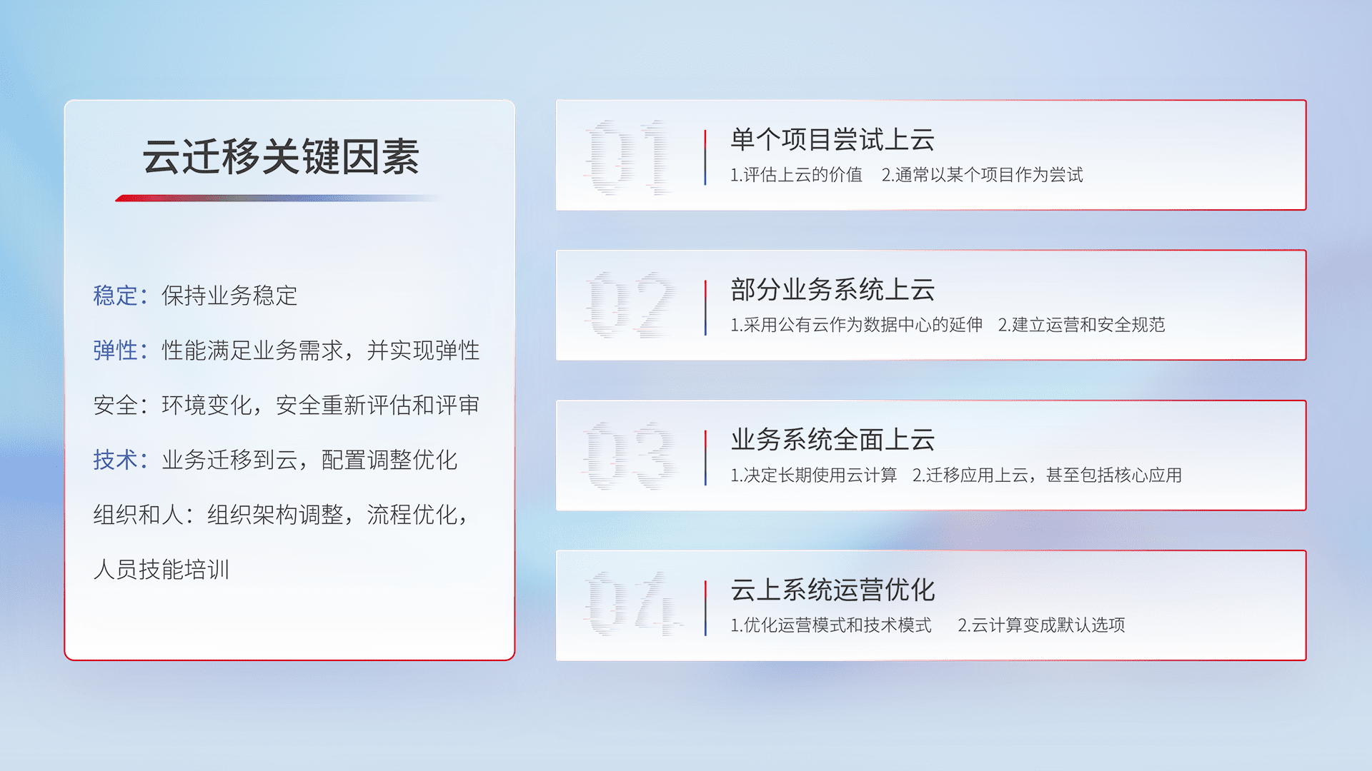 结合实际业务,,,从规划设计、、、、云平台选型、、、云原生改造、、、、数据迁移、、、、集成交付,,迁移全过程为客户识别最佳上云路径,,,,做好风险识别管理,,,设计网络架构、、、身份权限、、、、安全审计合规、、、、操作审计、、日志审计、、监控告警策略、、、多站点容灾设计等,,,,对云上基础设施进行整体规划,,,提升IT治理水平,,,,以满足弹性、、高可用、、高性能的需求。。