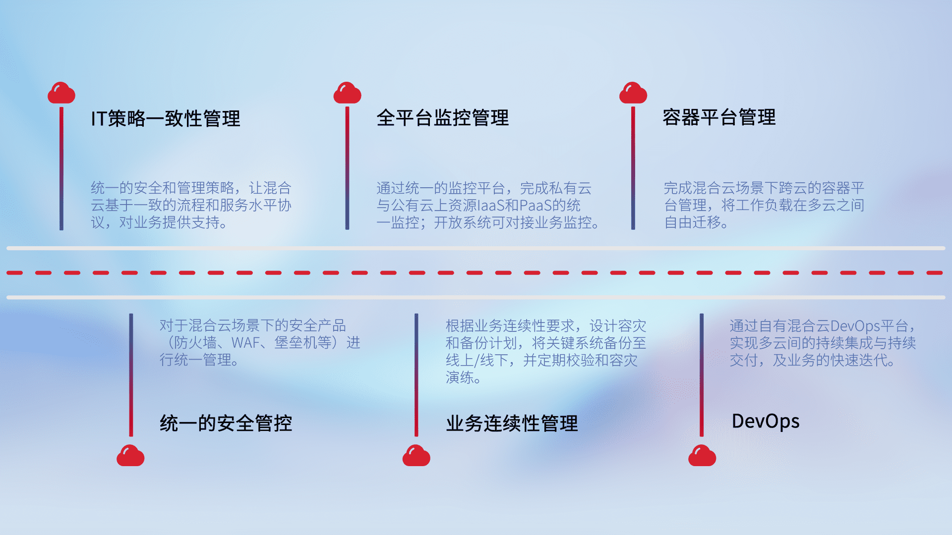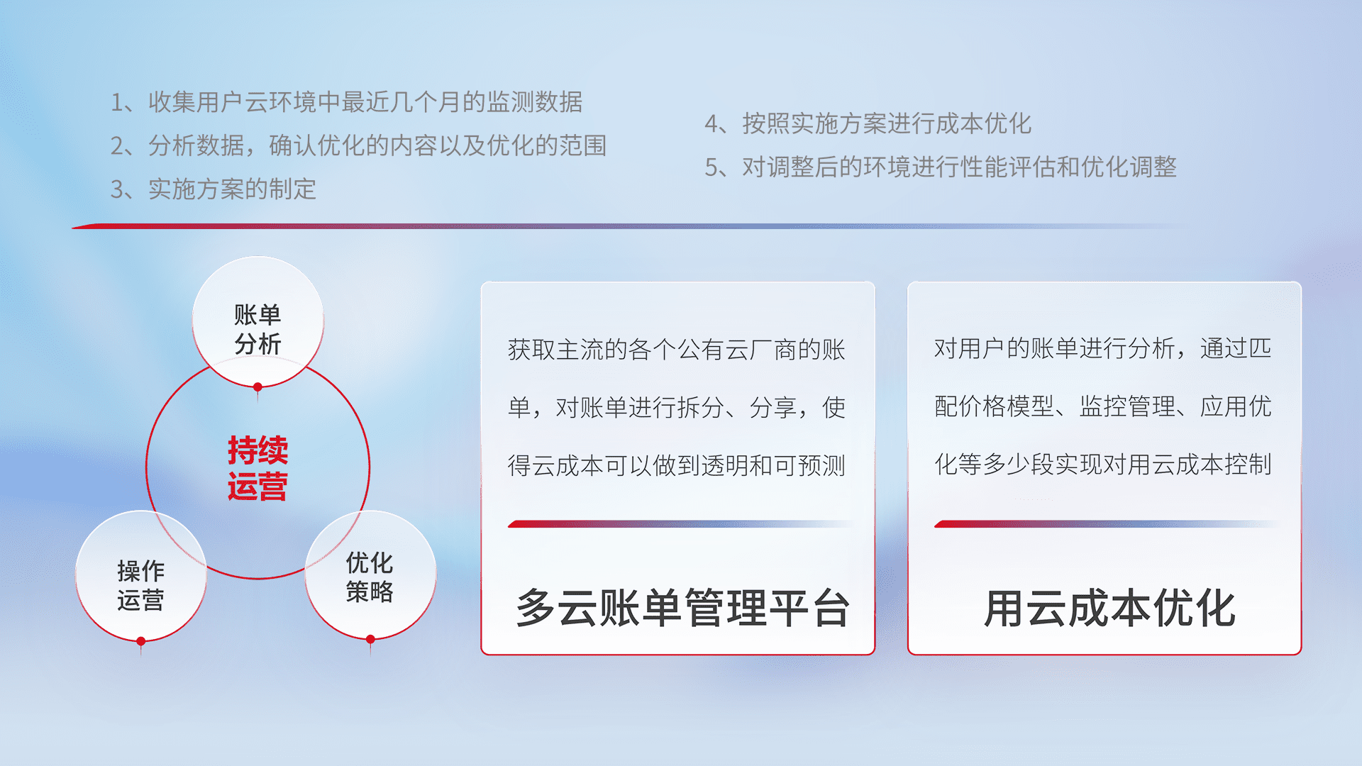 通过多云纳管,,,以统一的资源数据模型把客户的云资源进行抽象和封装,,,进而实现对多云资源的统一操作,,,,保障云资源管理的可靠性、、稳定性与可用性。。量身定制化运维内容,,,配置、、开发运维、、、、补丁管理、、备份、、、监控、、、、认证和访问管理、、、、审计和日常巡检等,,保障在用云过程中的可靠度,,,,稳定度以及高可用率。。。