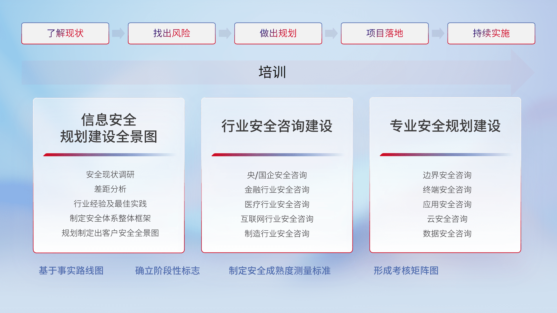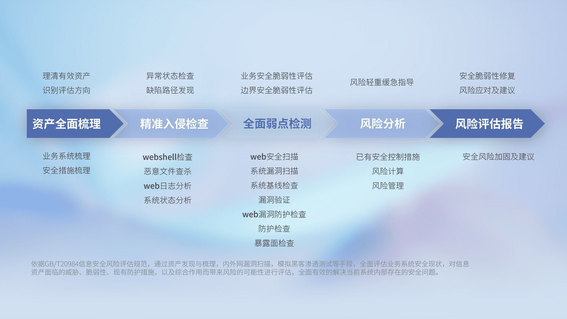 针对客户行业特性,,,以专业的安全服务+多厂商联合解决方案提供专属的一站式安全管理服务,,,帮助客户全面感知网络空间威胁,,基于识别、、、检测、、分析、、、防护、、、、监测、、响应的服务理论模型,,从方案咨询、、集成交付、、、评估验证、、优化加固、、运维运营,,,,致力于为客户提供完整的闭环管理式安全服务。。。以实战经验为客户打造高抵御风险的安全体系,,,帮助客户发现威胁、、、对抗威胁、、、、处置威胁,,不断积累安全对抗能力,,持续保障数字化安全。。。