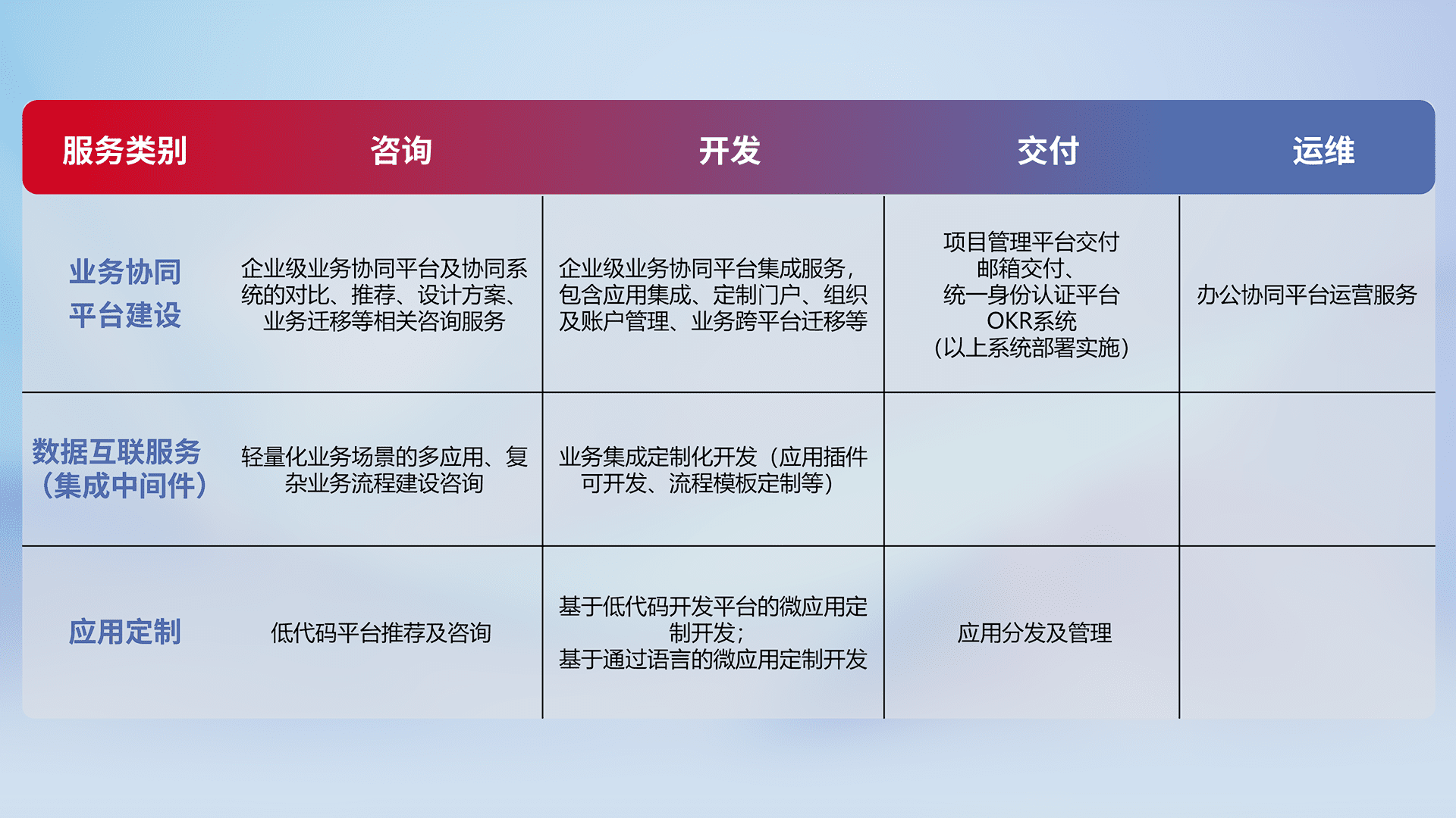 针对钉钉、、、企微、、IDaas等平台级产品提供产品的规划、、、、方案、、交付、、定制化开发等服务,,,,实现如统一协同办公、、、、智能客户服务、、、、混合会议管理、、、智能数据查询、、等业务场景,,实现数字化转型。。